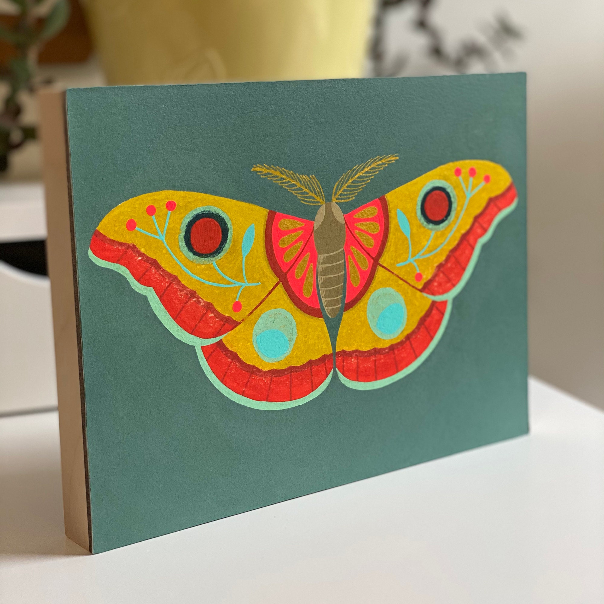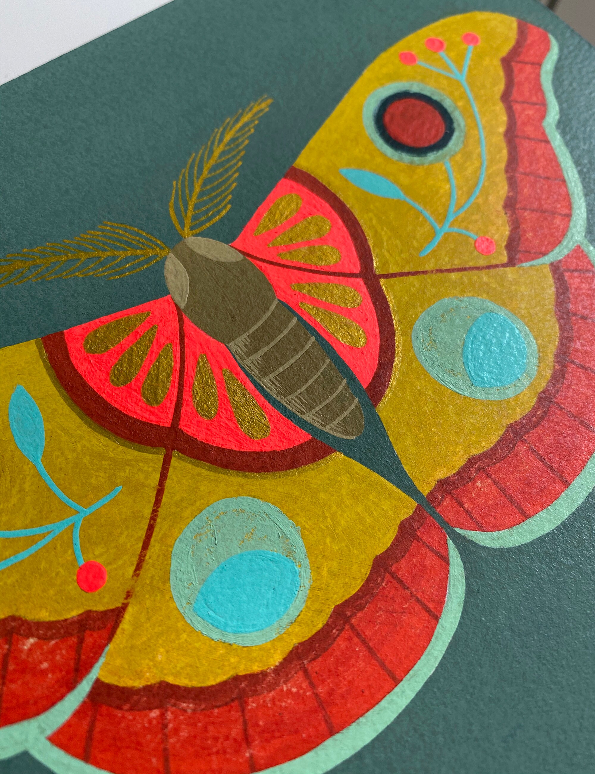 This is an original painting from my 'Specimen' series. Painted with gouache and gold ink on watercolor paper, then mounted to a cradled panel. A colorful folk-art inspired butterfly floats on a grey-green background. The surface has a protective coating that guards against damage while also adding a beautiful matte sheen.